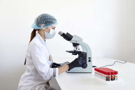 Female scientist looking through microscope in modern chemical laboratory doing some research. Analyzing blood samples using a microscope