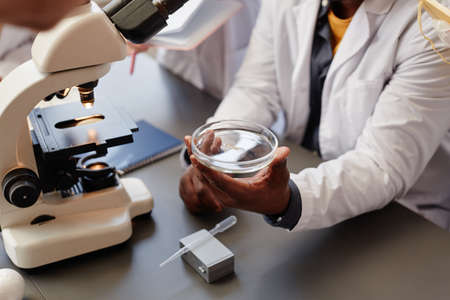 Close up of unrecognizable scientist holding petri dish by microscope in bio laboratory, copy space