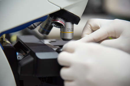 Closeup scientist hand using microscope in laboratory. Unrecognizable researcher working with coronavirus samples. Female doctor in glove doing experiment with covid-19 vaccine. Health care concept