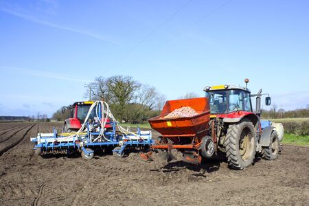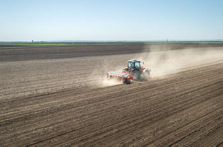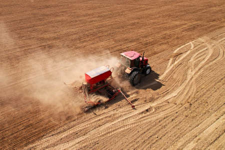 tractor sowing of seed to field at spring time