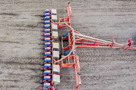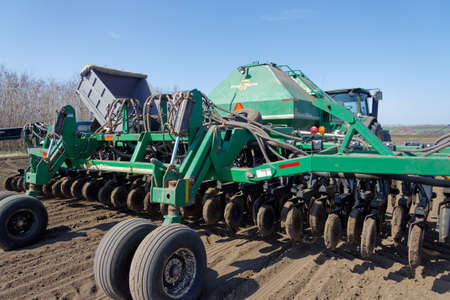 Precision seeder. Sowing equipment. Agricultural machinery sows on the field.