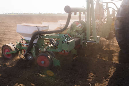 Corn seeder. Sowing on the field with a seeder of corn. Sowing of corn. Tractor with a seeder on the field. Using a seeder for planting corn