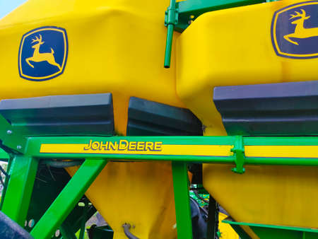 Kyiv, Ukraine - August 24, 2020: Pneumatic trailer Pneumatic seed loader John Deere 1910 at road at Kyiv, Ukraine on August 24, 2020. Agricultural machinery at Ukraine.