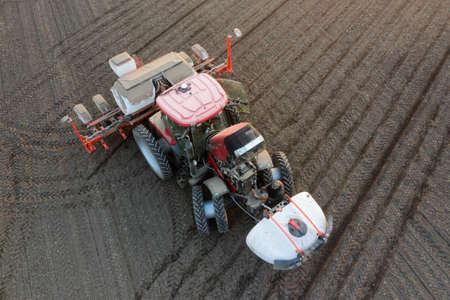 Aerial view of a modern multifunctional tractor, fertilizing pesticides, herbicides and sowing the area at the same time.