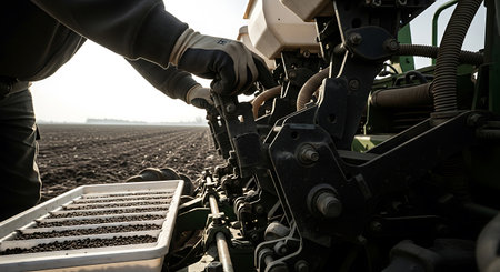 A farmer wearing gloves is planting seeds using a seeder on a plowed field. The machinery is primarily black and green. A white tray filled with black seed pellets is visible. The setting is a rural farm under sunlight.