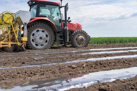 Tractor with Attachment Laying Plastic Mulch Bed On Farmland