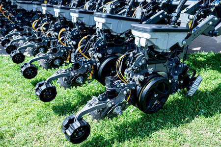 Agriculture machinery. Working parts of modern pneumatic agricultural seeder.