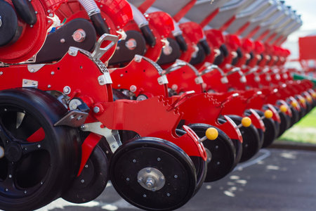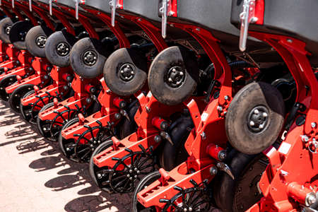 Mechanical components of a large agricultural seed drill, highlighting the vibrant red paint for planting season. Farming technology and industrial equipment