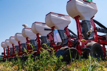 Tractor seeders close up, plastic equipment for seeding season in agriculture