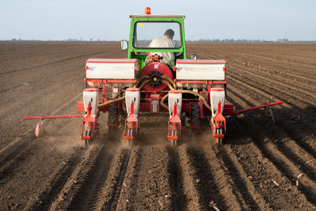 Farmer with tractor seeding - sowing crops at agricultural fields in spring