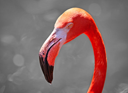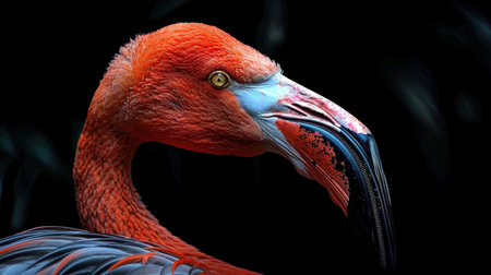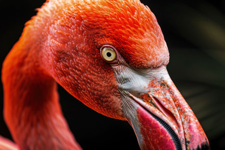 Close up of a vibrant orange flamingo against a dark background, showcasing its unique features and vibrant colors