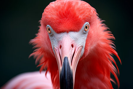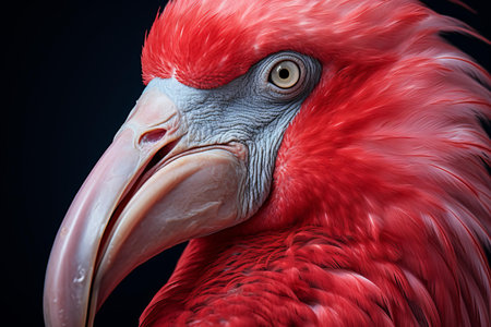 Detailed head shot of a vivid scarlet ibis bird its bright red feathers contrast with pale head and long curved black beak bird is looking to side showing its sharp eye wildlife portraiture