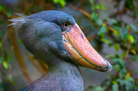 A Shoebill stork stares directly at the camera with a curious, almost comical expression. The bird's distinctive, large beak is prominent, and its feathers are a mix of brown and orange. The backdrop is a blurred image of green leaves and branches, providing a natural, vibrant context.