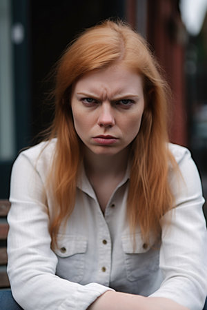 cropped portrait of a woman looking angry while sitting outside, created with generative ai