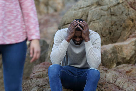 Side-view portrait of young Black man stressing and headache. Mental issues.