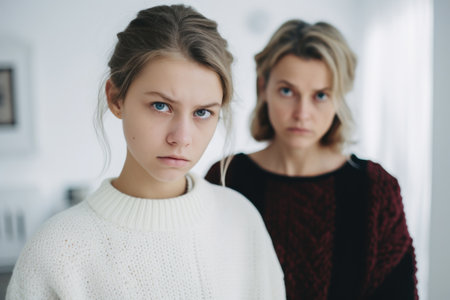 Family conflict, offended teen daughter and middle aged mum argument, close up upset girl in front and woman behind avoid to talk after quarrel at home