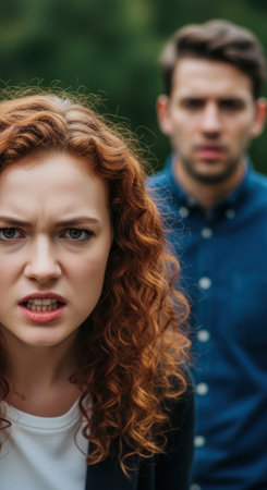 Upset woman with curly hair expressing anger outdoors while man stands in background looking concerned.