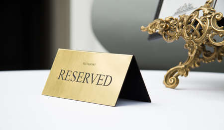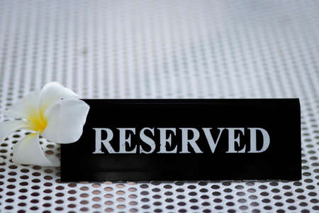 Reserved metal black plate in a restaurant. Reserved metal plate On the white table. vintage photo processing. close up of a setting a reserved sign on the restaurant table.