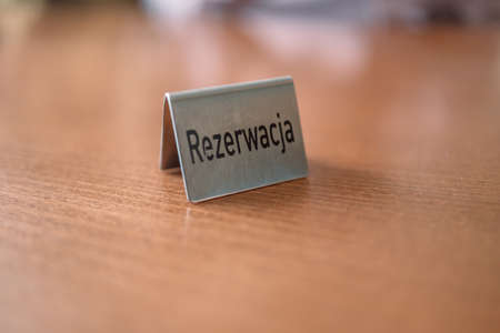 Metal reservado sign sitting on wooden restaurant table, marking reserved seating with soft background blur creating delicate bokeh lighting effect
