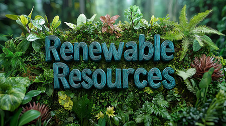 Vibrant 3D lettering of 'Renewable Resources' surrounded by lush green plants, symbolizing sustainability and eco-friendly concepts. Perfect for themes of nature conservation and environmental awareness.