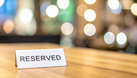 Reserved sign on wooden table in coffee shop blur background with bokeh image.