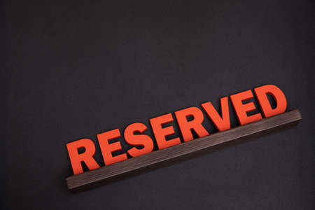 Service reserve at restaurant table. Large red plaque sign with wooden letters. Top view. Black background.