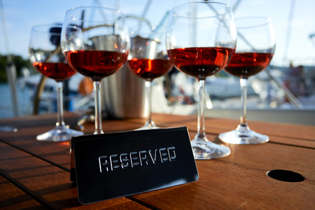 Restaurant reserved table sign with places setting and wine glasses ready for a party