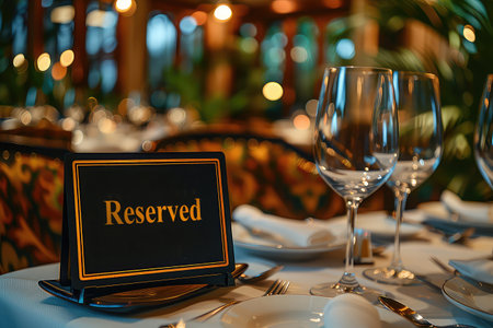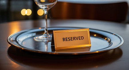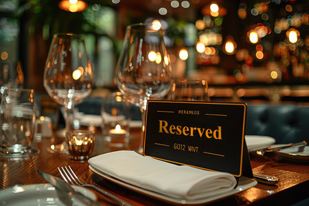 Reserved sign on restaurant table with soft lighting, minimalistic modern design. Cozy atmosphere for exclusive dining experiences or table reservations in upscale restaurants