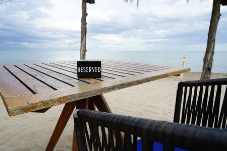 Restaurant reserved table sign Reserved Table. A tag of reservation placed on the wood table