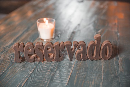 A modern idea for a reserved table with the inscription Reservation of your place. Idea restaurants the inscription reserved on a wooden table in a cafe.