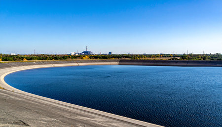 A vast expanse of deep blue water fills a man-made reservoir, its concrete embankment curving gracefully into the distance. Under a clear, cloudless sky, this vital water supply represents modern infrastructure, resource management, and the quiet power supporting urban life.