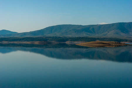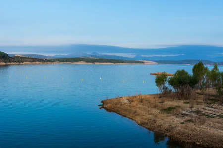 Mountain lake in Spain early in the morning. Spanish landscape at sunrise, hills, water, beach and sunlight