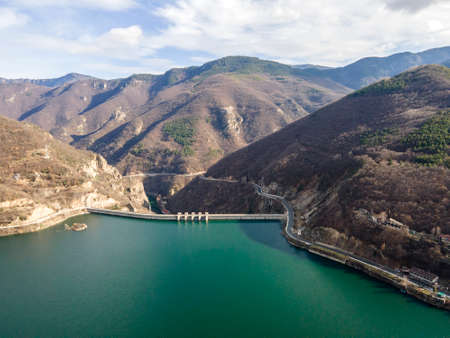 Aerial view of dam of Vacha (Antonivanovtsi) Reservoir, Rhodope Mountains, Plovdiv Region, Bulgaria