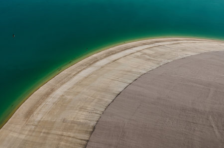A captivating aerial view showcasing a water reservoir with a dark concrete wall, contrasting against the serene blue of the water surface, highlighting natural beauty.
