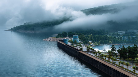 A hydroelectric dam nestled in a verdant landscape, water flows through the dam generating clean energy.