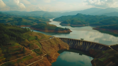 Generative AI, hydroelectric dam utilizing the flow of water to produce sustainable energy, aerial drone view,