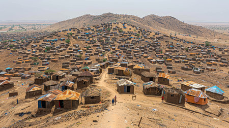 Aerial view of a large community on a hillside featuring numerous dwellings with tin roofs and pathways, evoking a sense of rural life and resilience under the open sky.