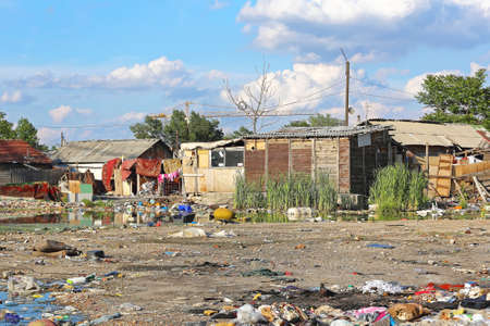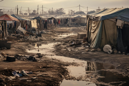 This powerful image captures the harsh realities of urban slum conditions, showcasing waste, overcrowding, and environmental neglect in city landscapes.