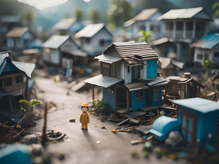 Devastation unfolds along a quiet coastal village where homes and boats lie scattered after a monumental storm. Debris strewn across the landscape showcases nature's fierce power and resilience.