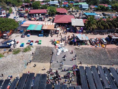 Penaga, Penang/Malaysia - Mar 14 2020: Aerial view people buy seafood at jetty.