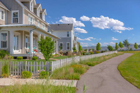 frame Row of homes with grassy yards balconies outdoor stairs and white fences. Trees, blue sky, and thick clouds can alsobe seeb in this scenic neighborhood.