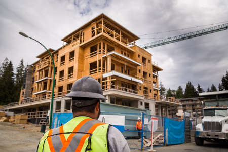 Construction worker in a hardhat observes an apartment complex under construction.