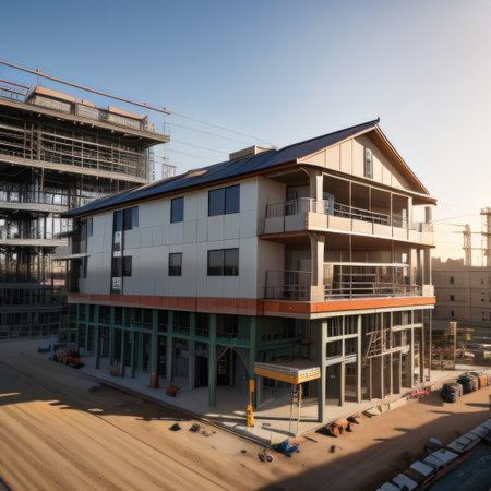 A striking image of a modern residential building under construction at sunset, featuring scaffolding and expansive glass, capturing the essence of contemporary architecture in a tranquil setting.