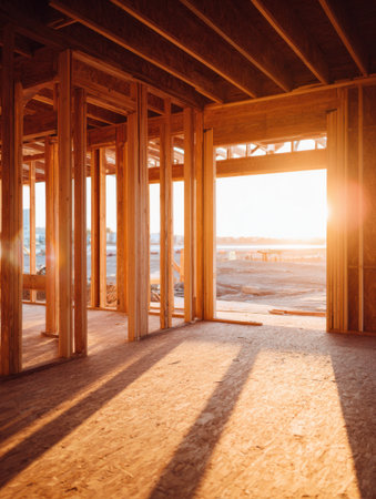 Wooden frames of a building are illuminated by sunset light, casting long shadows. This construction site showcases the progress of a new development.