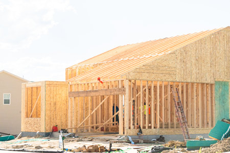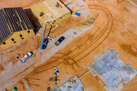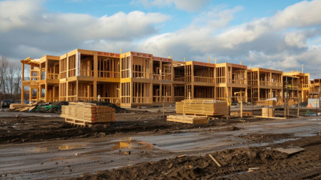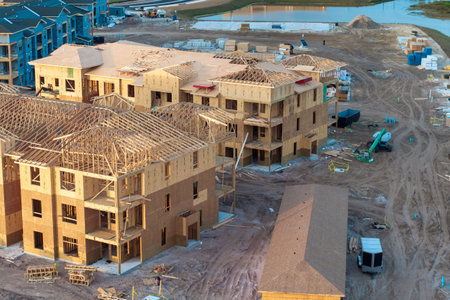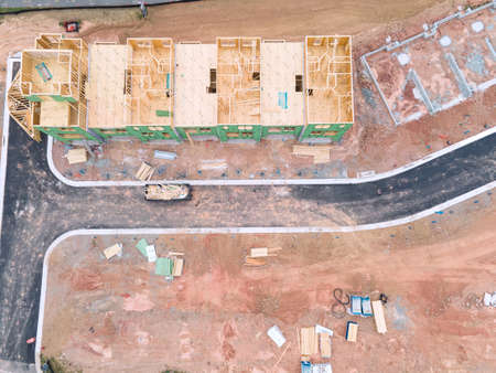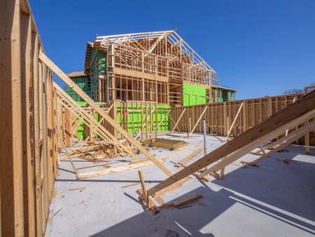 Development of residential housing in American suburbs. Unfinished frames of apartment condos with wooden roof beams under construction. Real estate market in the USA