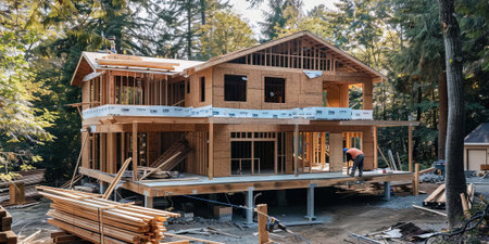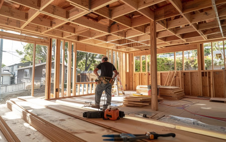 A bustling construction site showcasing a wooden framework, tools, and a toolbox. Captures the essence of building and craftsmanship in progress.