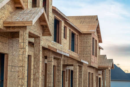 Close up of the exterior of townhomes under construction against cloudy sky. Building new residences foe a neighborhood housing development.
