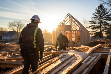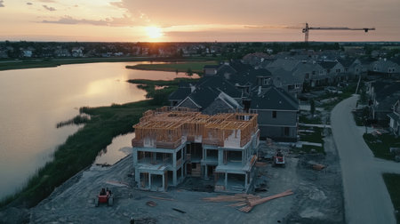 Construction workers building a new house during sunset in a residential area