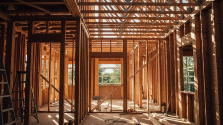 interior of spacious building construction of frame house under construction.