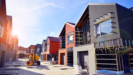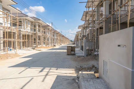 Construction project of new real estate property showing houses next to each other with some infrastructure still needs finishing solving housing shortage.Housing estate development neighborhood